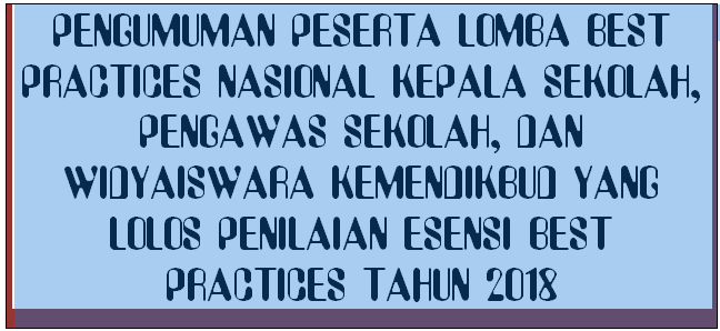 Berikut Pengumuman Finalis atau Peserta Lolos Seleksi Lomba Best Practices Nasional 2018 Kepala Sekolah, Pengawas Sekolah, dan Widyaiswara Kemendikbud Tahun 2018.